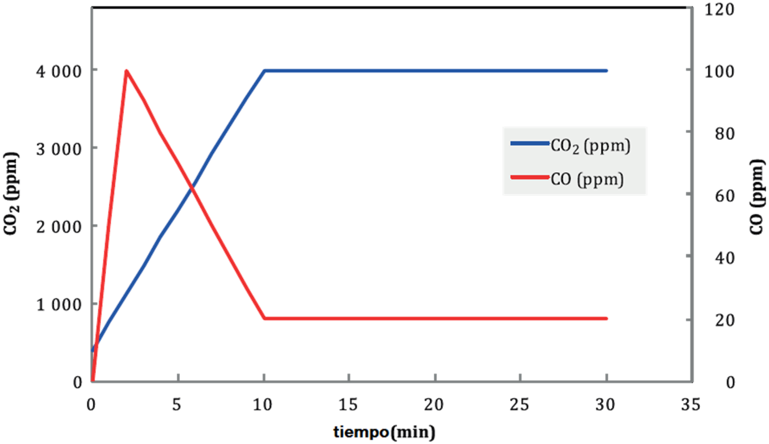 Figura C.3 - Concentraciones variables en el tiempo de CO2 y CO en el tubo de muestra
