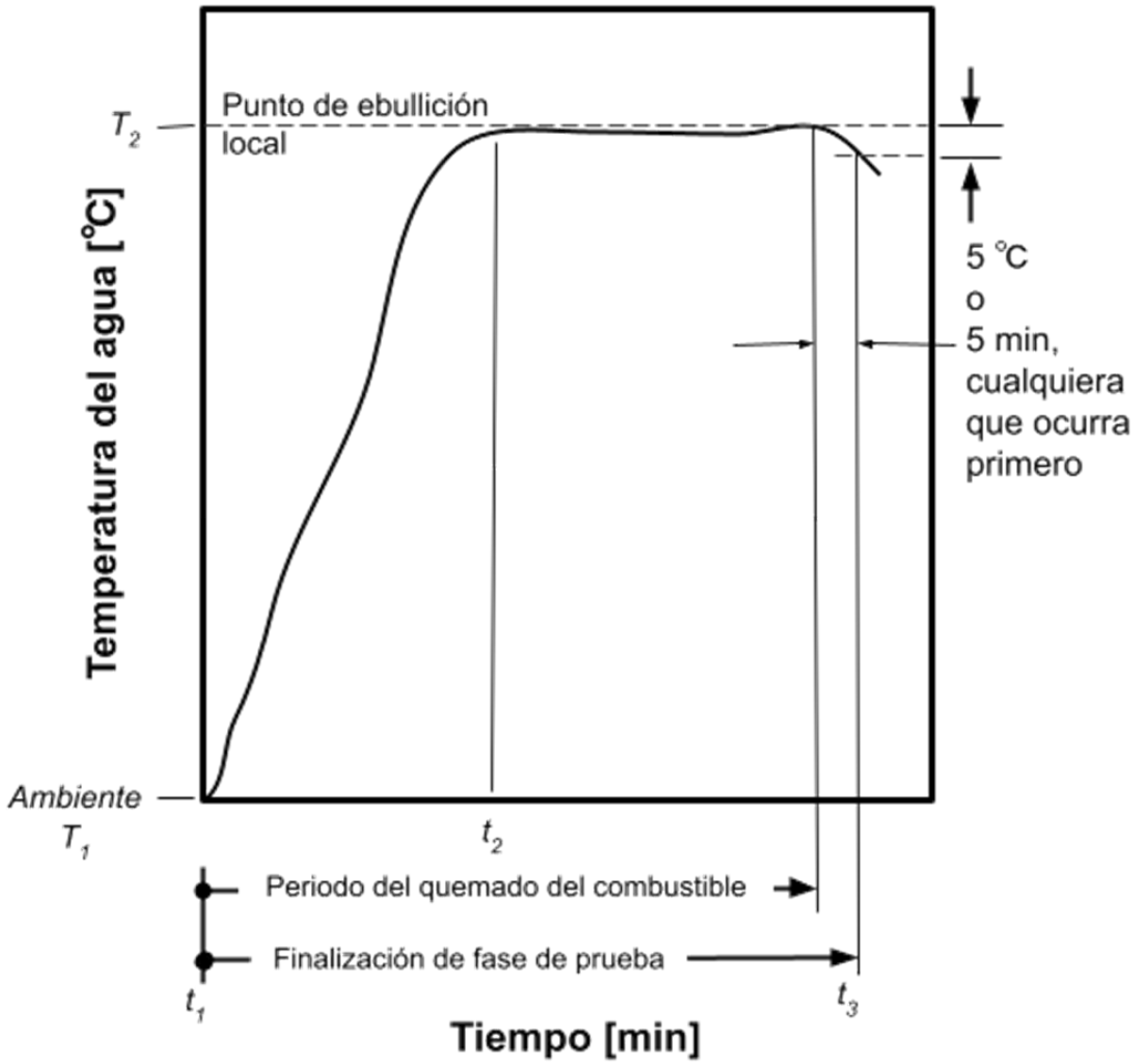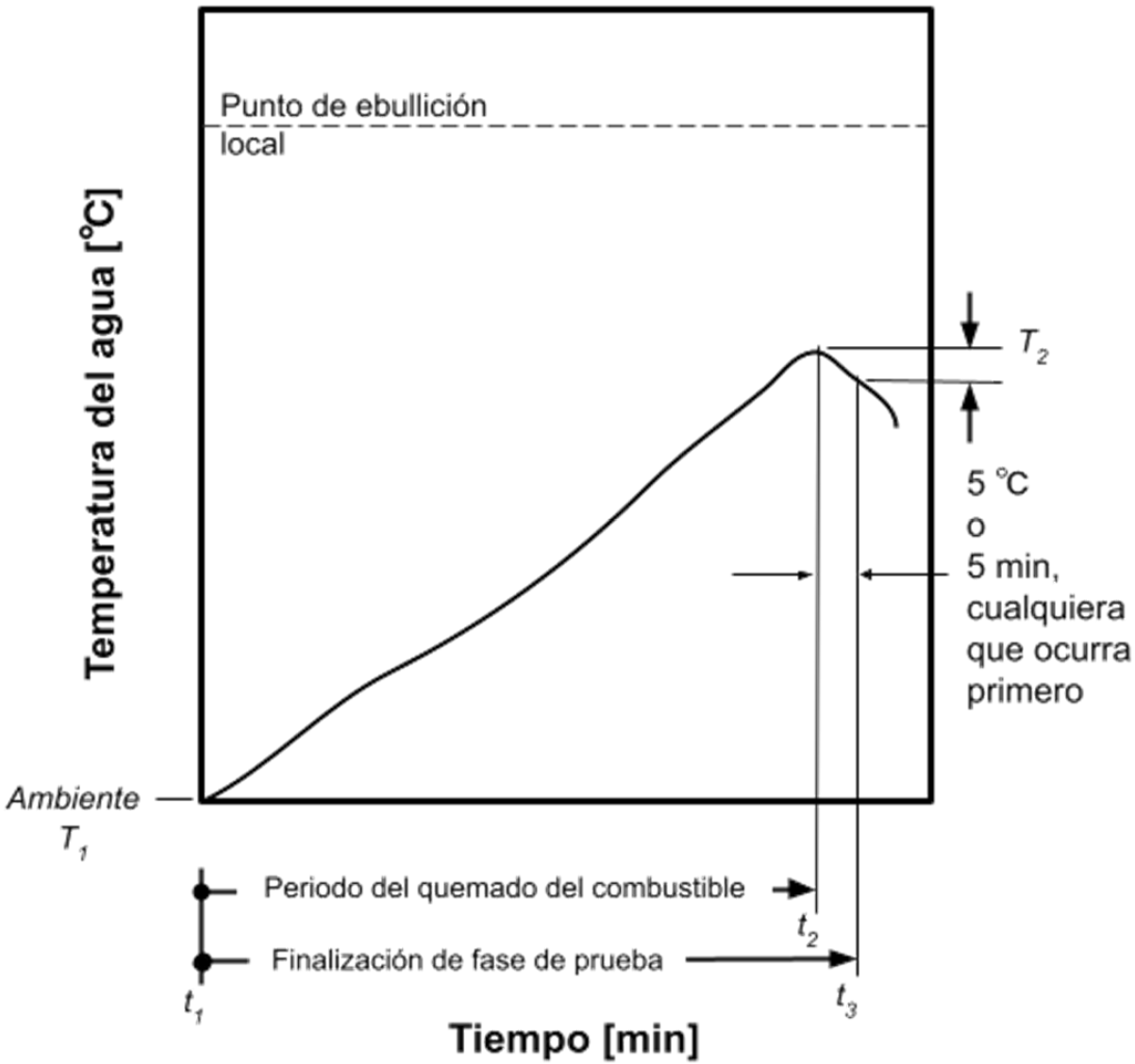 Figura 4 - Gráfico ilustrativo de la temperatura del agua contra el tiempo para cualquier fase de prueba cuando la temperatura del agua alcanza el punto de ebullición local al final del período de combustión del biocombustible